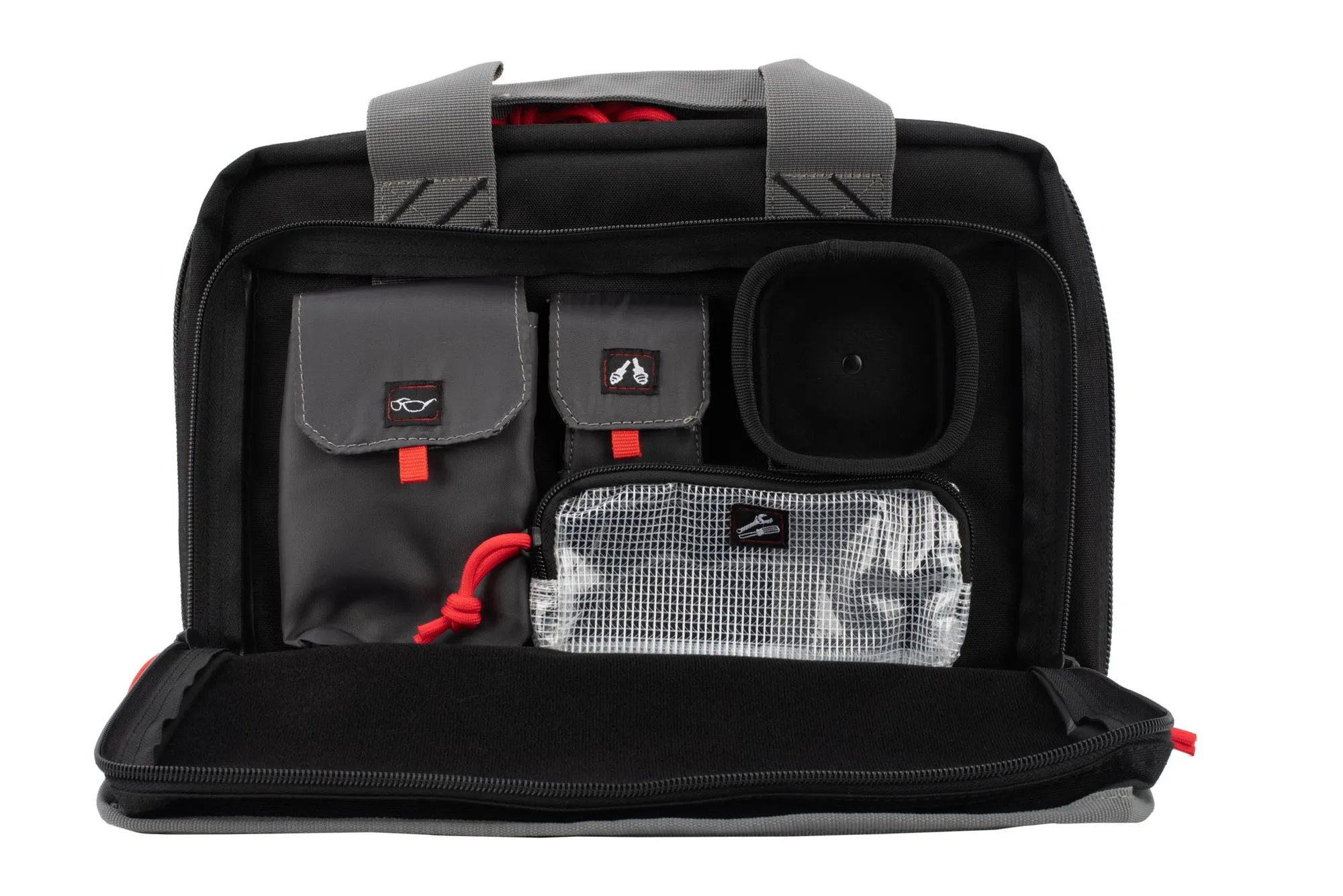 The G.P.S. Quad Case is a durable and versatile range bag. It is a soft case featuring a thick tricot quilted liner with room to carry four tools. It offers organized space for your day at the range with 2 side pockets, 6 additional pockets, and Visual I.D. Storage System. The 2 side pockets are designed to open and lay flat for easy access and organization. One of the side pockets offers their Visual I.D. Storage System with icons to clearly identify ear plugs, safety glasses, and maintenance tools. These easily identifiable icons allow you to recognize where your items are stored quickly and efficiently. The other side pocket is equipped with elastics for storage of a cleaning rod and gun cleaner spray. The lockable heavy-duty zippers allow you to lock your tools providing additional security making this case ideal for security.